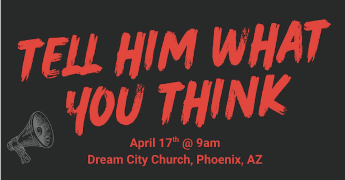 Donald Trump is coming to the valley for an event with TPUSA, Erika Kirk, and Andy Biggs. We need to send a LOUD message that he is not welcome here. The event will take place at Dream City “Church”. We’ll be parking down the street and singing the sidewalks. Details can be found here.